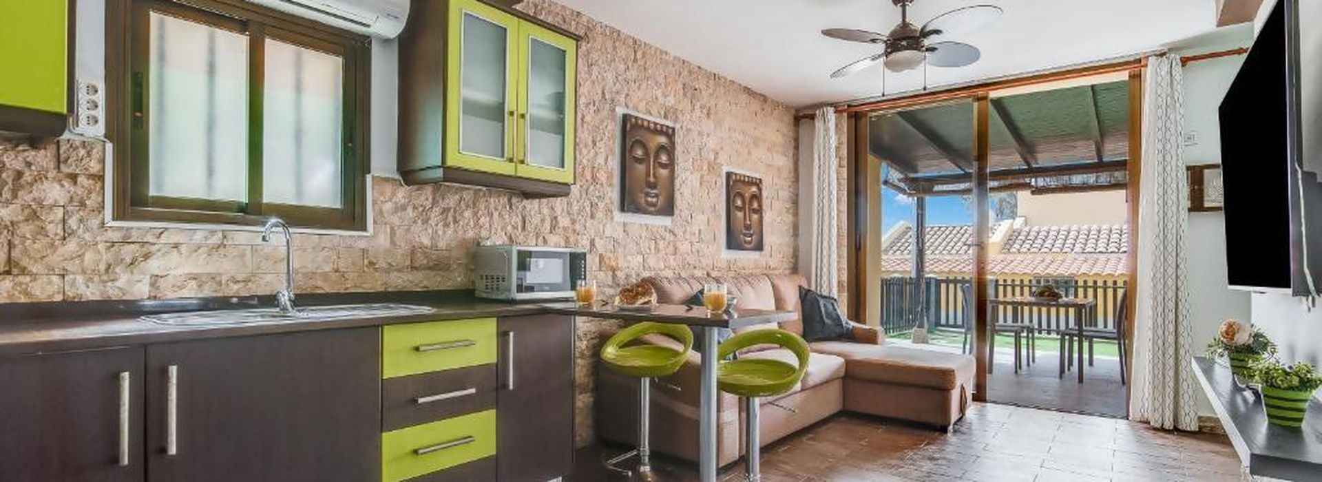 Bonito apartamento con terraza y barbacoa en un tranquilo complejo residencial con piscina en Maspalomas. Cuenta con capacidad para 4 personas distribuidos en dos acogedoras habitaciones, la principal con cama doble, y la secundaria con cama nido formada por dos camas individuales, dispone de Smart TV de 60 pulgadas, aire acondicionado y WiFi de Fibra a 300mbs y acceso directo a la amplia terraza con comedor, tumbonas y zona de barbacoa, ideal para disfrutar de buenos momentos con un clima agradable y poder tomar el sol.